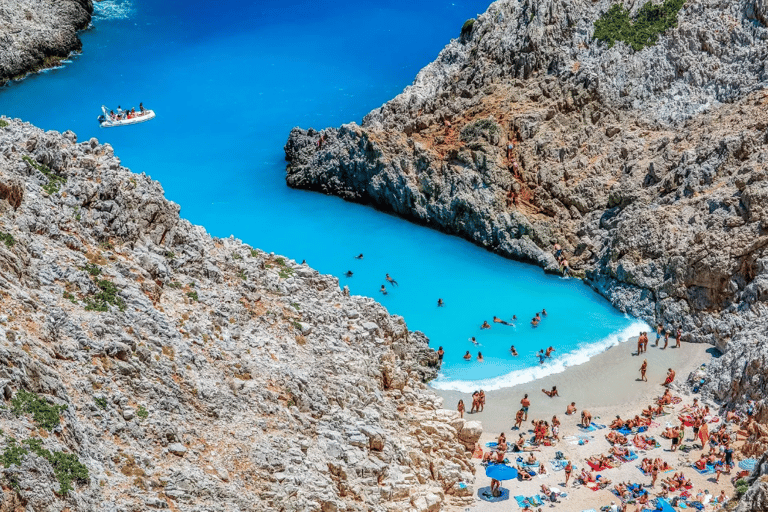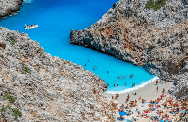 For a secluded paradise, venture to Seitan Limani, where the azure waters meet rugged cliffs, creating a breathtaking scene.