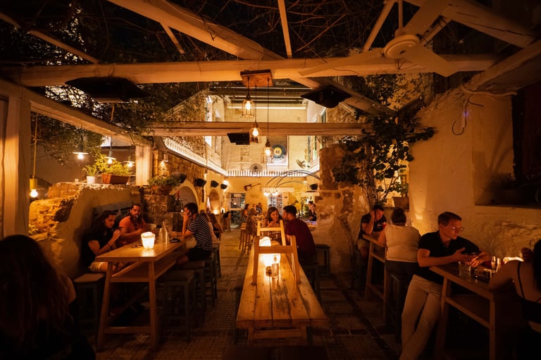 In the old town at night, indulge in delightful drinks at the bars Monastiri tou Karolou or Sinagogi coctail bar promising an experience that will exceed your expectations. Revel in the company of great people, savor exquisite cocktails, and bask in the enchanting atmosphere of these astonishing spots.