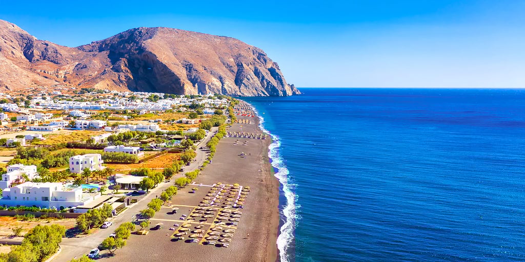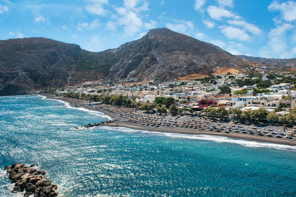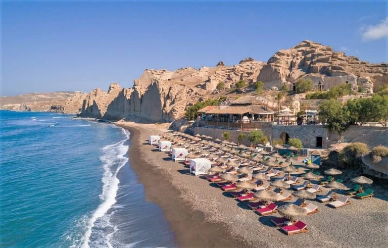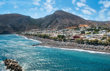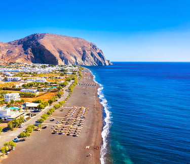 Start your journey at Perissa Beach, renowned for its black volcanic sand and clear waters. This beach offers a unique experience with well-equipped beach bars, sunbeds, and water sports facilities, making it perfect for a relaxing or adventurous morning.