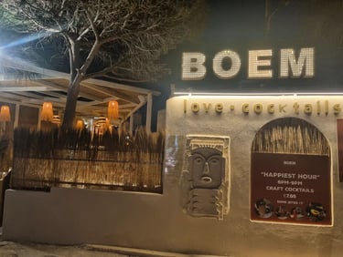 Lastly, for a vibrant night out visit Boem Santorini Cocktail Bar in Fira. Known for its creative cocktails and lively atmosphere, Boem offers a stylish setting with stunning views of the caldera. Enjoy expertly mixed drinks while soaking in the lively vibe and beautiful sunset, making it a must-visit spot for cocktail enthusiasts.