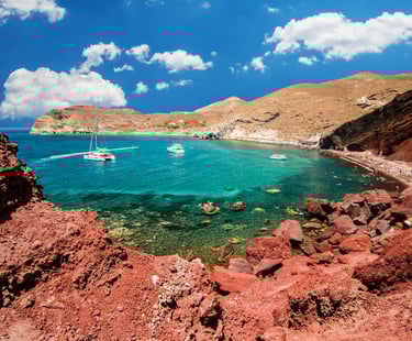 Another must-see beach when in Santorini is the iconic Red Beach. The striking red volcanic cliffs and pebbles create a dramatic and unforgettable landscape, perfect for snorkeling and capturing stunning photos.
